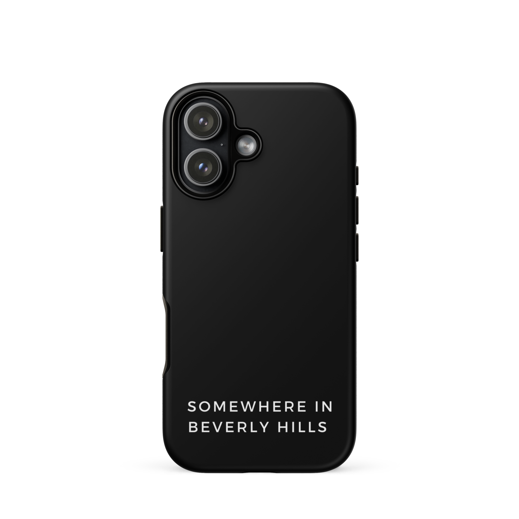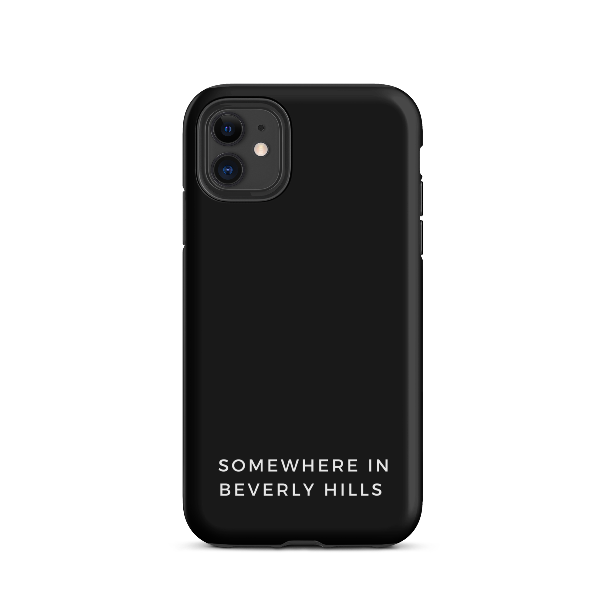 Matte black iPhone case with SOMEWHERE IN DENIAL text.